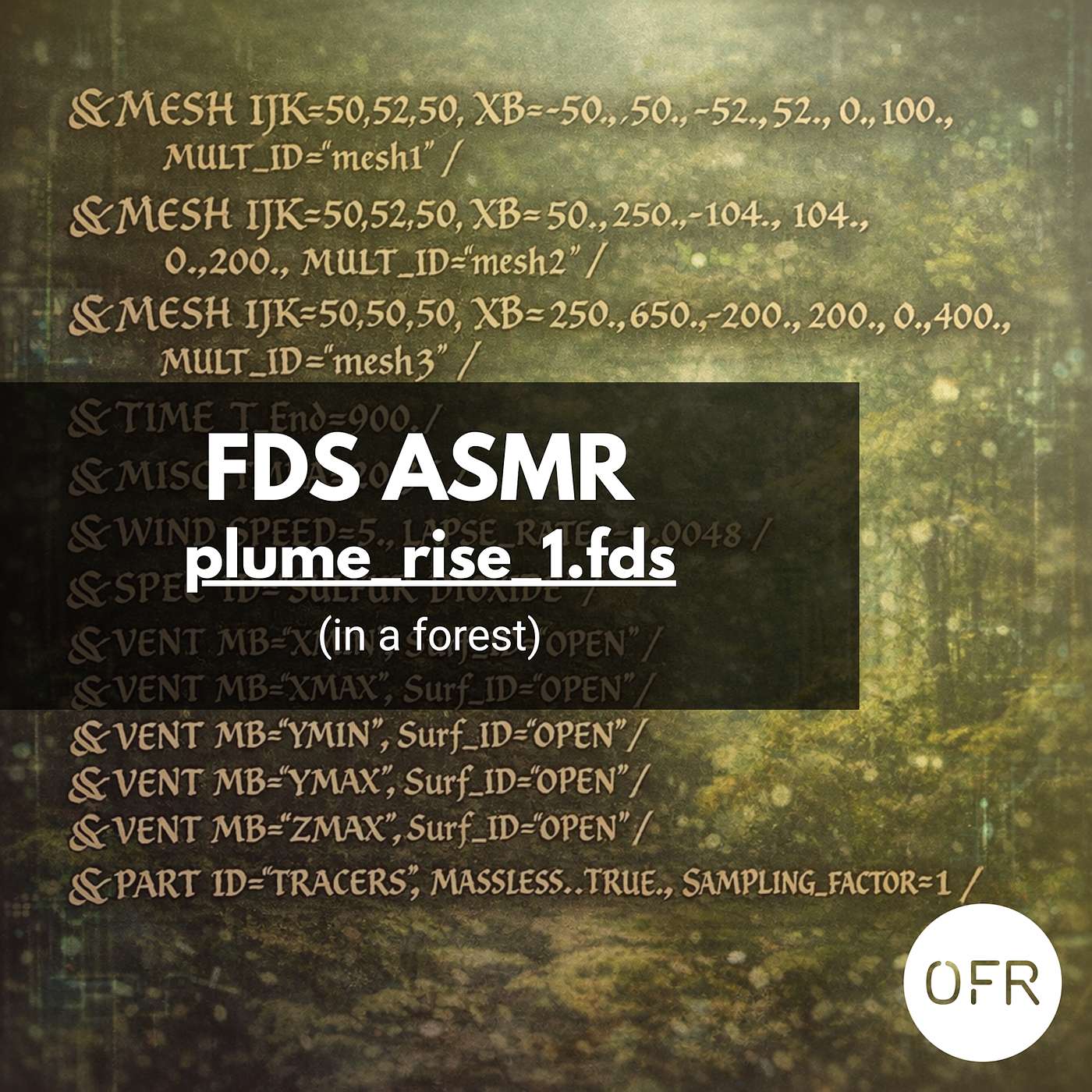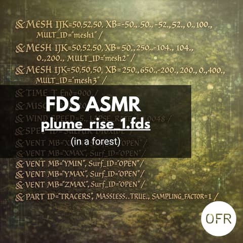 plume_rise_1.fds from the FDS Validation Guide (by NIST) &HEAD CHID='plume_rise_1', TITLE='Test plume rise height in stable atmosphere' / &MESH IJK=50,52,50, XB=-50.,50.,-52.,52.,0.,100., MULT_ID='mesh1' / &MULT ID='mesh1', DZ=100., K_UPPER=1 / &MESH IJK=50,52,50, XB= 50.,250.,-104.,104.,0.,200., MULT_ID='mesh2' / &MULT ID='mesh2', DZ=200., K_UPPER=1 / &MESH IJK=50,50,50, XB=250.,650.,-200.,200.,0.,400., MULT_ID='mesh3' / &MULT ID='mesh3', DX=400., DZ=400., ...